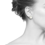 - Expertly handcrafted, these exquisite earrings feature a large round simulated pearl enveloped by round stones set at alternating heights. A bold alternative to classic round studs.