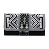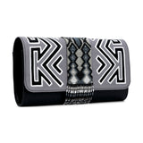 - Leather clutch featuring one-of-a-kind Mola fabric and Embera beading detail