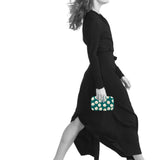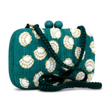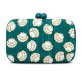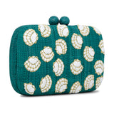 - Hand embroidered shells on raffia clutch with snakeskin closure